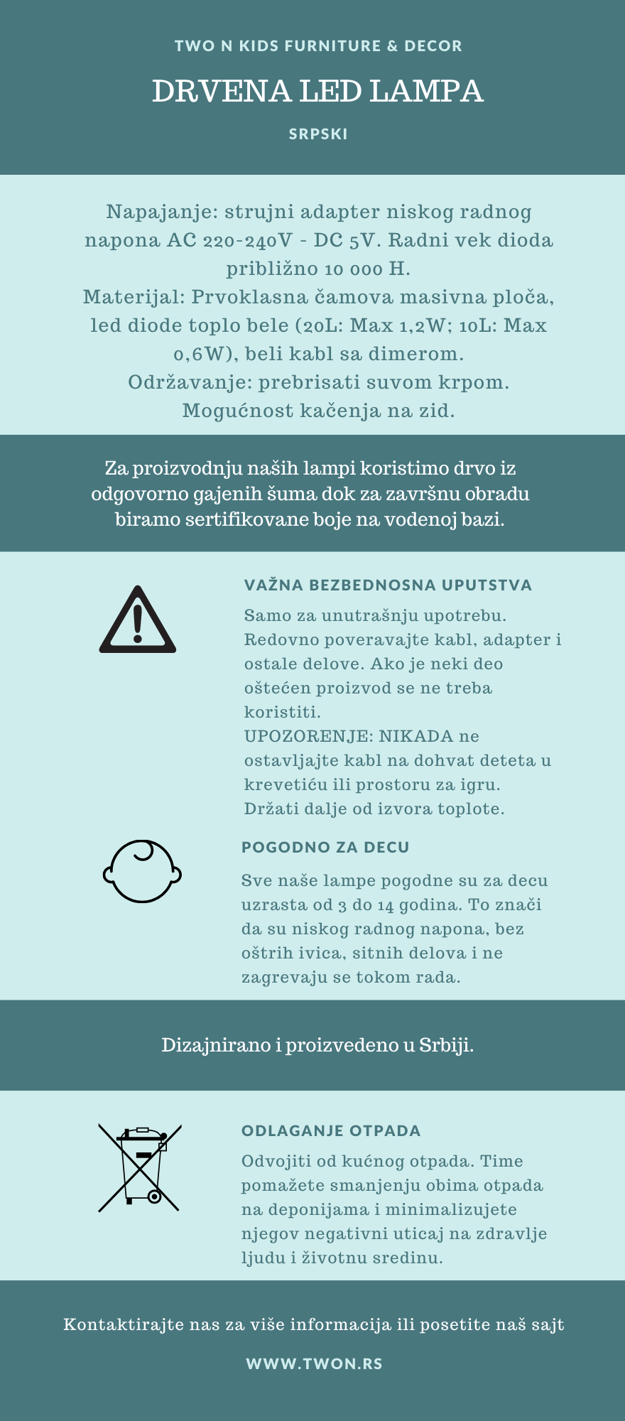 Za proizvodnju naših lampi koristimo drvo iz odgovorno gajenih šuma dok za završnu obradu biramo sertifikovane boje na vodenoj bazi. Zbog prirode materijala gotovo nije moguće napraviti dva identična proizvoda a veoma često su prisutne i sitne greške drveta kao što su čvorovi i sitne pukotine. To svaku našu lampu čini unikatom.